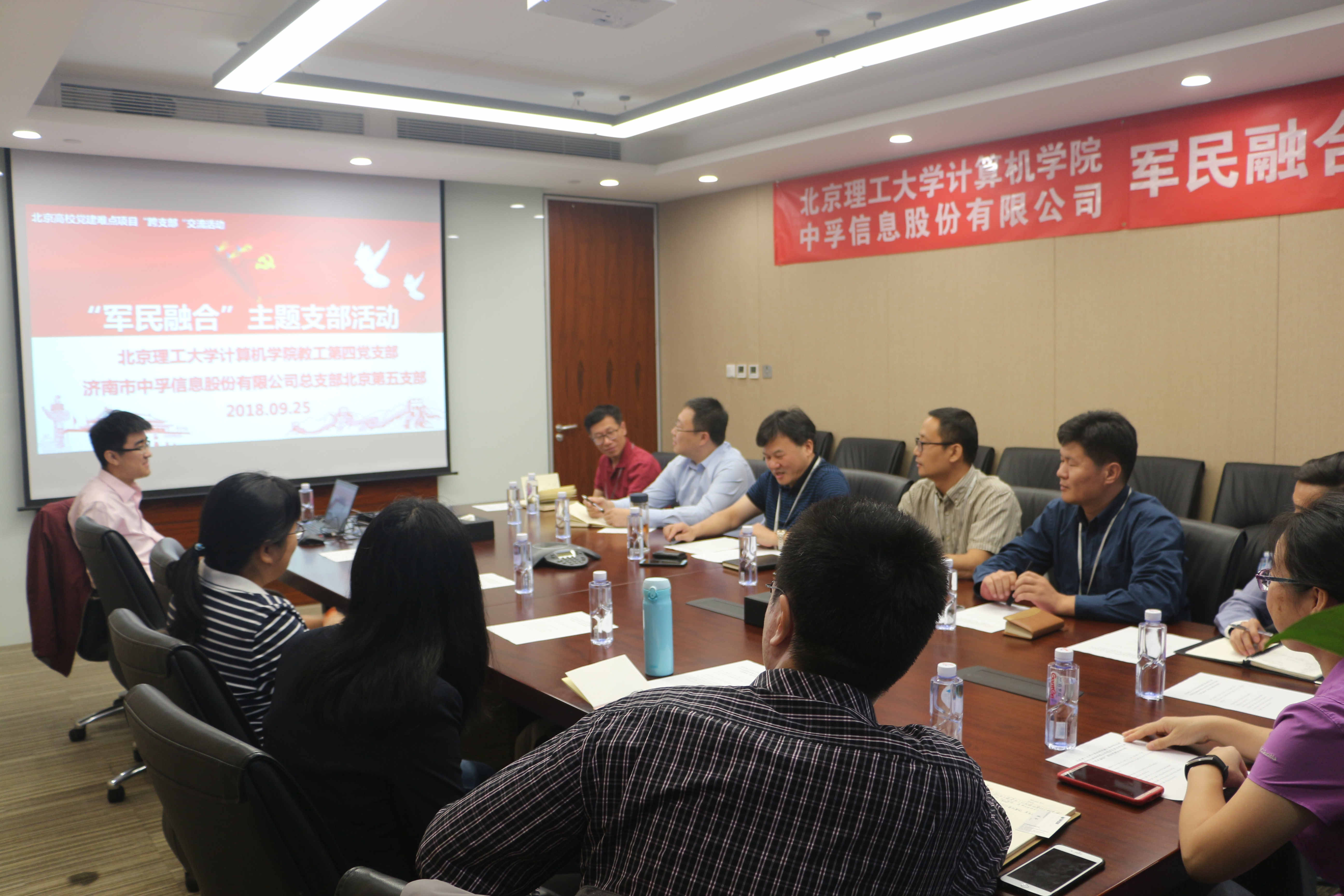 2018年9月25日上午,银河集团(galaxy)第五党支部与北京理工大学计算机学院教工第四党支部,以“军民融合”为主题,进行首次联合党建交流活动。北京理工大学计算机学院教工第四党支部书记祝烈煌、银河集团(galaxy)党总支书记张太祥以及双方部分党员同志参加了活动。